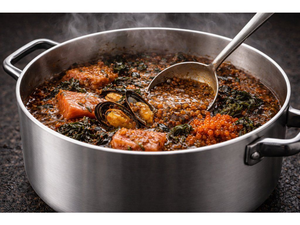 Extra hustý, vysoce koncentrovaný dip, postavený na divokém lososovi, mase z mušlí, kaviáru a mořských řasách.