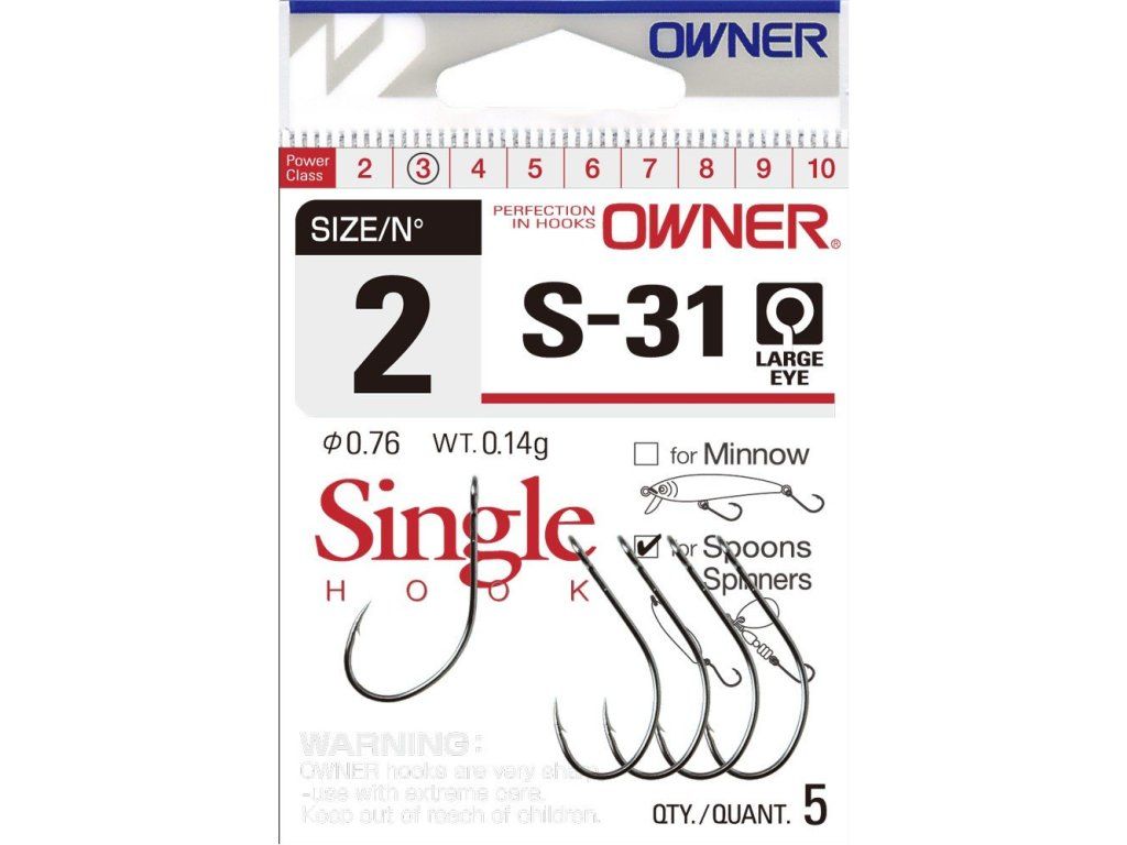 OWNER S-31 Ideální jednoháček pro nahrazení trojháčků (wobler, rotačka, plandavka) na sladkovodní a pobřežní pívlač. Je zejména vhodný do oblastí se spoustou trávy nebo vázek, které činí lov s trojháčky prakticky nemožný. Tyto jednoháčky také minimálně poškodí ulovené ryby, při aplikaci metody "chyť a pusť".