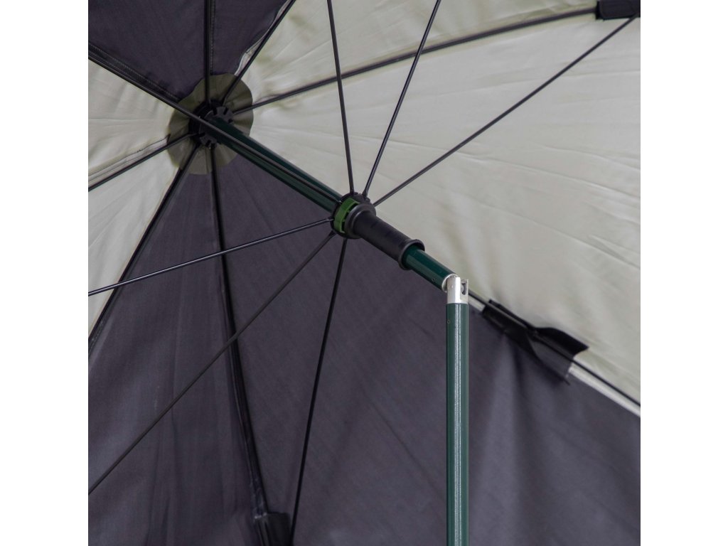 Vysoce kvalitní rybářský deštník o průměru 250 cm (měřeno přes vrchlík). 100% voděodolný, s podlepenými švy, nastavením úhlu a bočními stěnami. Dokonalý přístřešek do každého počasí. Provedený v designu série Method Feeder.