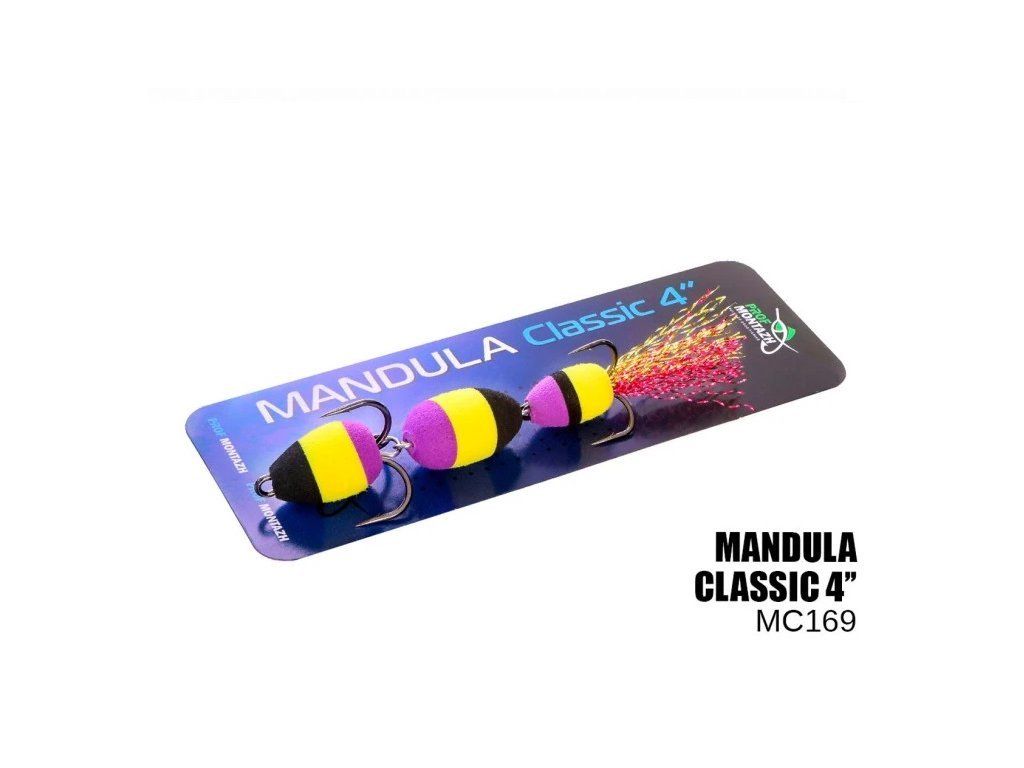 Mandula Classic 3 segmenty 100mm (#169) – má nejširší paletu – 152 kontrastních, dvou a tří barevných kombinací, vám umožní vybrat si mandulu pro jakýkoli vkus a podmínky lovu dravců. Vyrobeno ze 3 segmentů proudnicového tvaru. Dnes se tento tvar těla již stal klasikou a byl testován miliony rybářů po celém světě. Celková délka 10 cm je univerzální střední velikost, dobře se hodí pro lov různých dravců: candáta, štiky, okouna, sumce a dokonce i osina. Osazeno dvěma ostrými odpališti čísel 2 a 4. Trim na ocasu je vyroben z kvalitního dvoubarevného lurexu, který je ve fázi výroby manduly navíc ručně načechraný. Nástraha funguje dobře jak na stojatých vodách, tak i v proudu. Není nijak náročná na druh zátěže (skládací Cheburashka, Jig – Rig, Dancing – Rig a další). Díky proudnicovému tvaru těla umožňuje lovit na velké vzdálenosti, kde ryby z velké části nejsou tak bázlivé a ostatní rybáři je netlačí.
