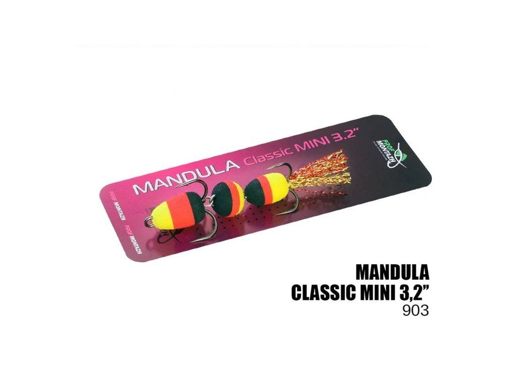 Mandula Classic Mini 3,2” (#903) – vyrobeno ze 3 kulových segmentů. Každý segment je k sobě připevněn pevným nerezovým drátem o průměru #0,8. Celá řada Classic je spolehlivá a výkonná. Vybavena dvěma ostrými odpališti číslo 2 a 4. Ozdoba na ocasu je vyrobena z vysoce kvalitního lurexu, který je navíc ve fázi výroby manduly uvolněn ručně.