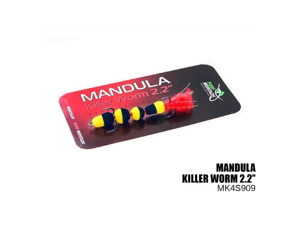 Mandula Killer Worm 4 segmenty 55mm (#909) – tělo se skládá ze 4 segmentů, každá část je oddělena korálky, celková délka mandulky je 55mm. V řadě Killer Worm se jedná o středně velkou mandulu, skvělou jak pro microjig, tak pro lehký lov. Za prvé, trofejí této mandule jsou okouni, ale candáti a štice se také nebrání hodovat na tak chutné napodobenině červa.