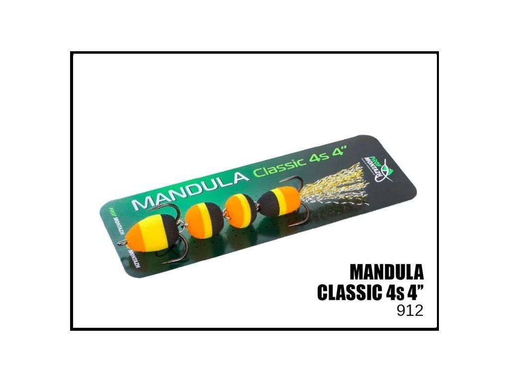 Mandula Classic 4S 4” (#912) – skládá se ze 4 kulovitých segmentů – to zajišťuje návnadě zvýšenou pohyblivost ve vodě. Je vybavena dvěma ostrými odpališti čísel 2 a 4. Okraj na ocásku je vyroben z kvalitního lurexu, který je ve fázi výroby manduly navíc ručně povolován.