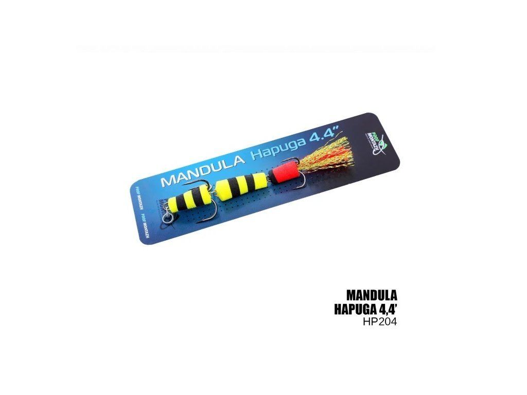 Mandula HAPUGA 4,4” – má válcovitý tvar segmentů těla, osazena dvěma ostrými odpališti čísel 1 a 4. Ideální poměr velikosti háčku a objemu těla nám umožnil získat háček se zvětšenou užitnou plochou, toto řešení několikanásobně zlepšuje rychlost záseku a udržení dravce na háčku.