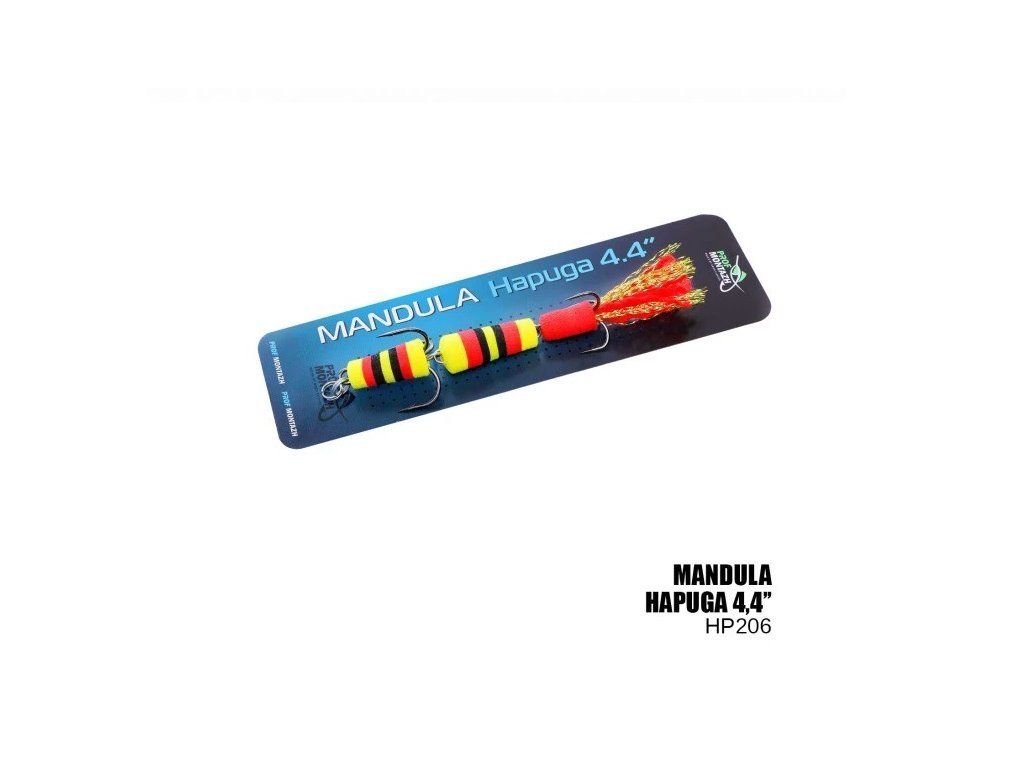 Mandula HAPUGA 4,4” – má válcovitý tvar segmentů těla, osazena dvěma ostrými odpališti čísel 1 a 4. Ideální poměr velikosti háčku a objemu těla nám umožnil získat háček se zvětšenou užitnou plochou, toto řešení několikanásobně zlepšuje rychlost záseku a udržení dravce na háčku.